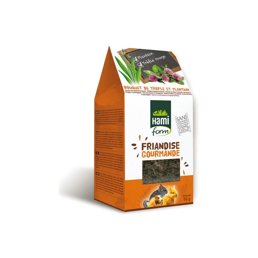Begrüßen Sie die Natur mit den „Gourmet Treats“ von Hamiform ! Bouquet of Clover and Plantain Treats ist eine köstliche Mischung aus Wegerich und Rotklee für Kaninchen und Nagetiere. Es hilft bei der guten Verdauung und hat dank Klee und Spitzwegerich entzündungshemmende Eigenschaften. Ohne künstliche Aromen oder Konservierungsstoffe sollen sie die Geschmacksknospen erfreuen und die Vitalität Ihrer kleinen Begleiter steigern.