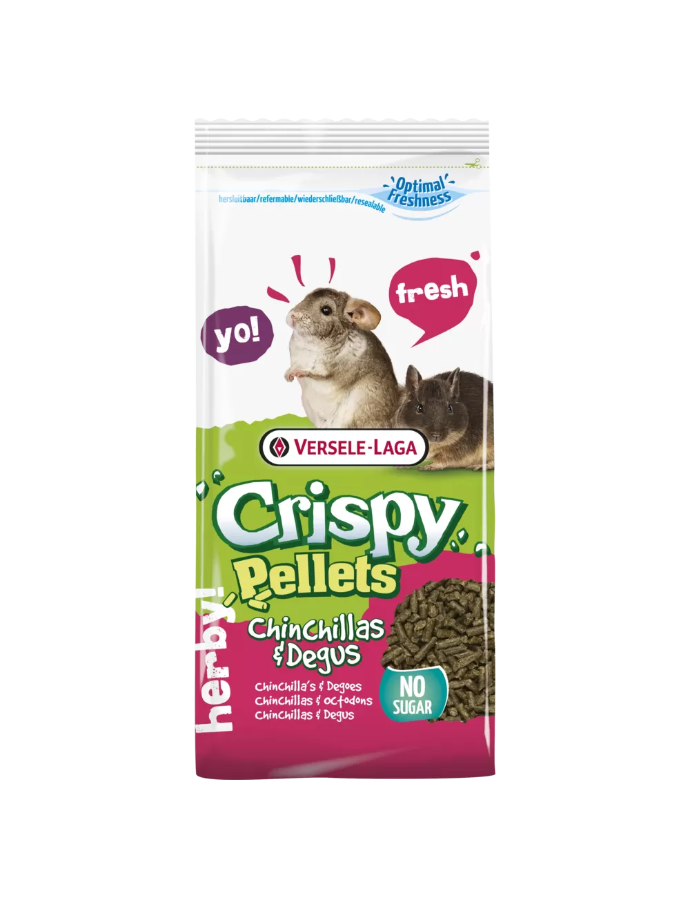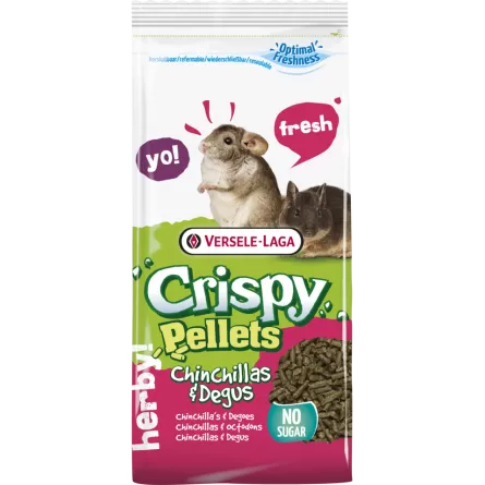 Versele-laga - Crispy PELLETS CHINCHILLAS & DEGUS ist ein Alleinfutter speziell für Chinchillas und Degus . Reich an Ballaststoffen und voller natürlicher Kräuter eliminieren diese All-in-One-Pellets das Risiko einer selektiven Fütterung. Darüber hinaus garantiert die „Happy & Healthy“-Formel die Versorgung mit allen wichtigen Nährstoffen. Und das Tüpfelchen auf dem i: kein Zuckerzusatz! Für eine optimale Gesundheit Ihres kleinen Begleiters.
