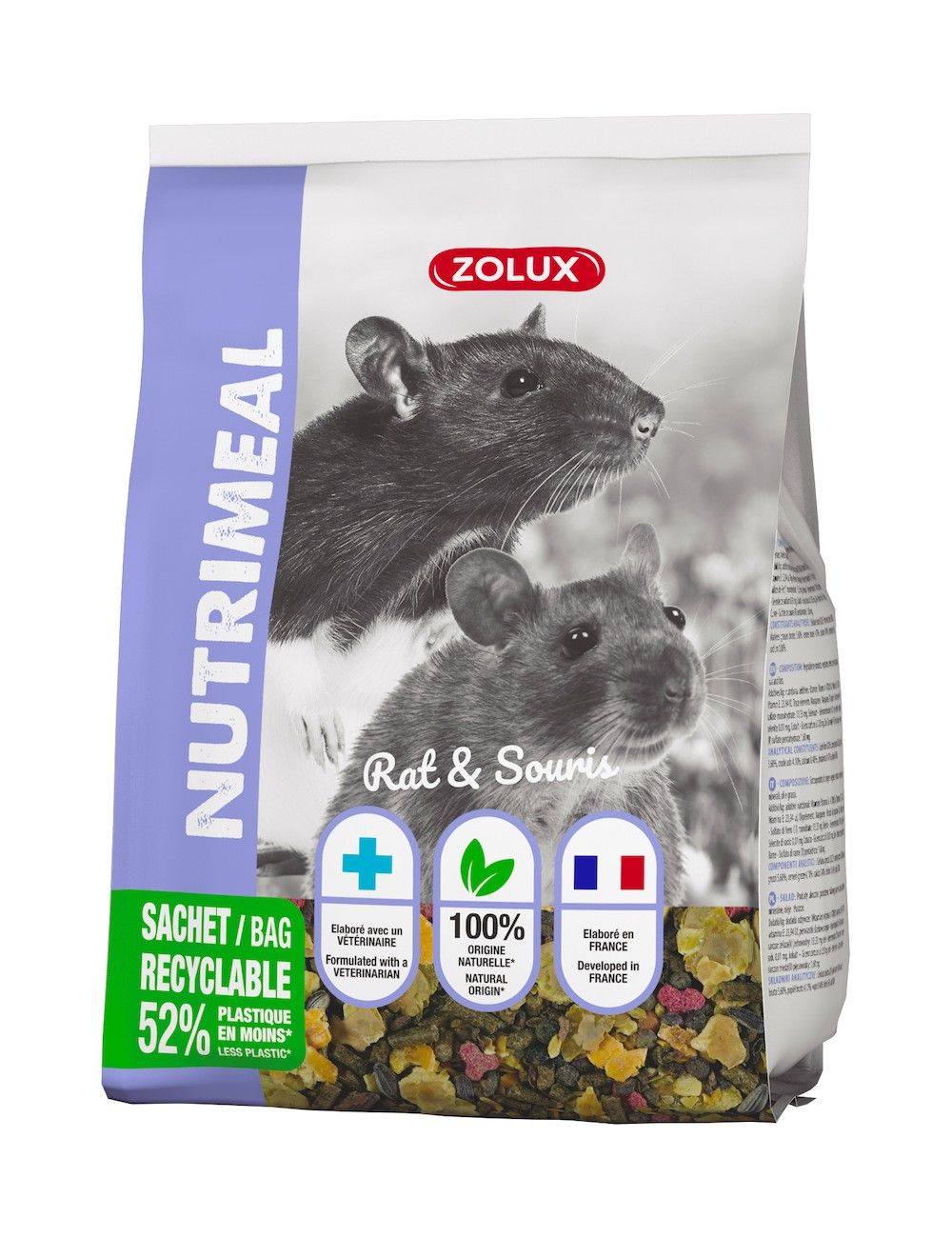 Nutrimeal Muesli for rats and mice from ZOLUX is developed under veterinary supervision and made in France. This nutritious mixture combines granules, flakes and seeds in a 100% organic recipe. Rich in vegetable proteins and without artificial additives , it meets the specific needs of these little creatures, promoting their vitality while delighting their taste buds.