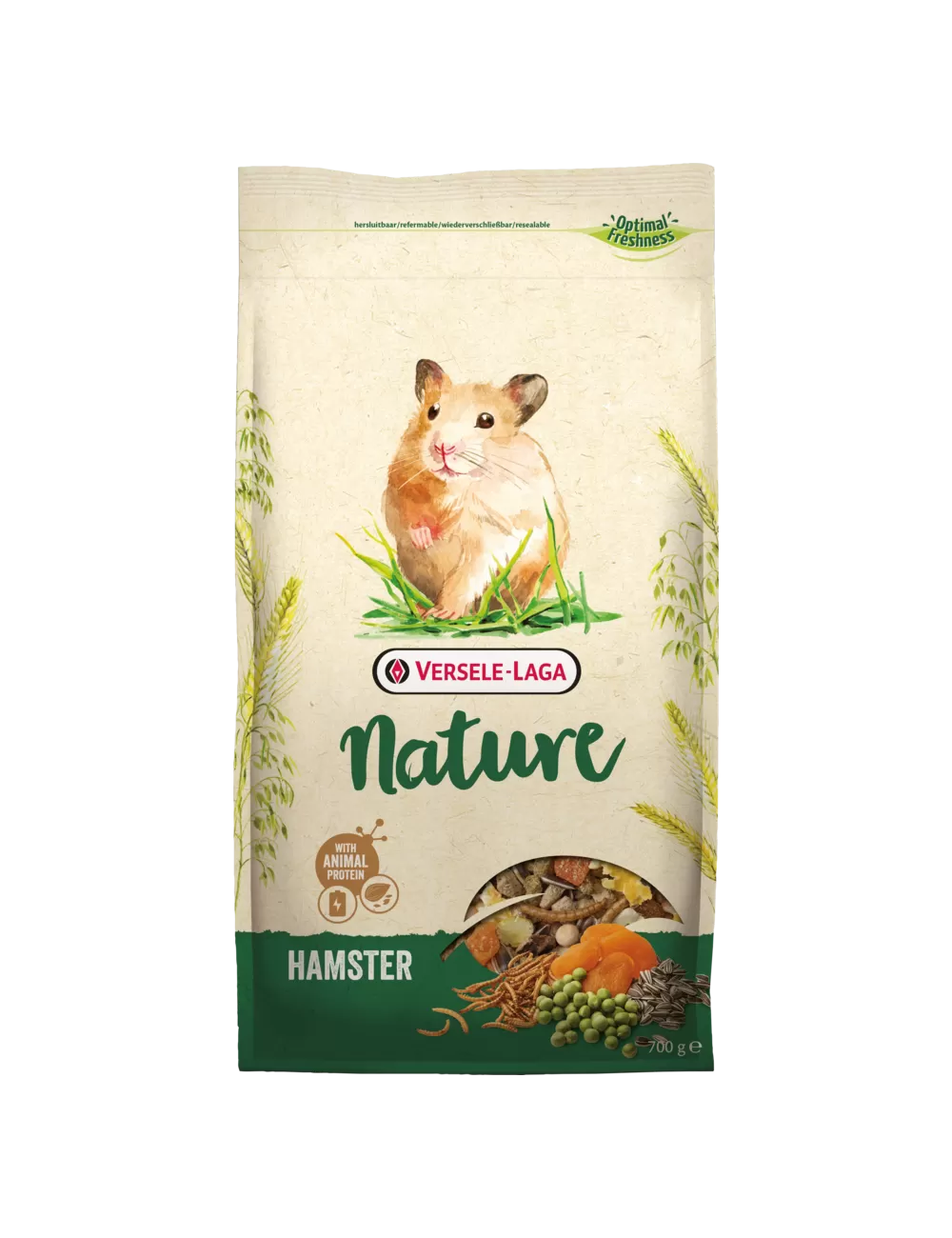 Versele Laga Nature Hamster turns every meal into a feast for your little companion! Designed to specifically meet the energy needs of hamsters, this mixture rich in cereals, nuts and seeds is the essential ally of a complete diet. Thanks to animal proteins from mealworms, your hamster benefits from a balanced diet, guaranteeing its vitality. Choose quality with this food that combines flavor, nutritional benefits and energy.
