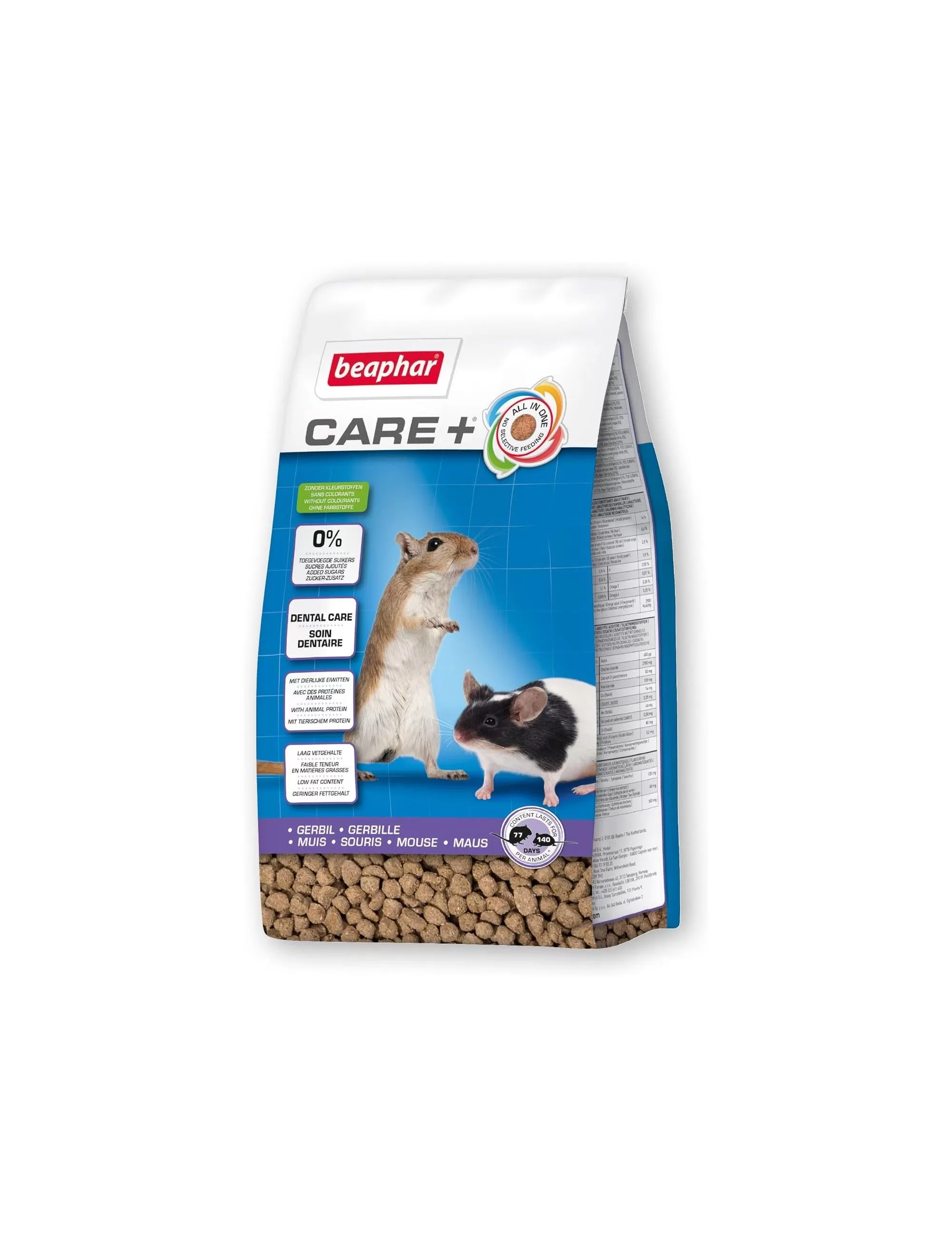 With BEAPHAR - Care+, every bite is a promise of well-being. Each all-in-one pellet is designed to avoid food sorting , ensuring that your gerbil or mouse receives a balanced diet, without deficiencies.