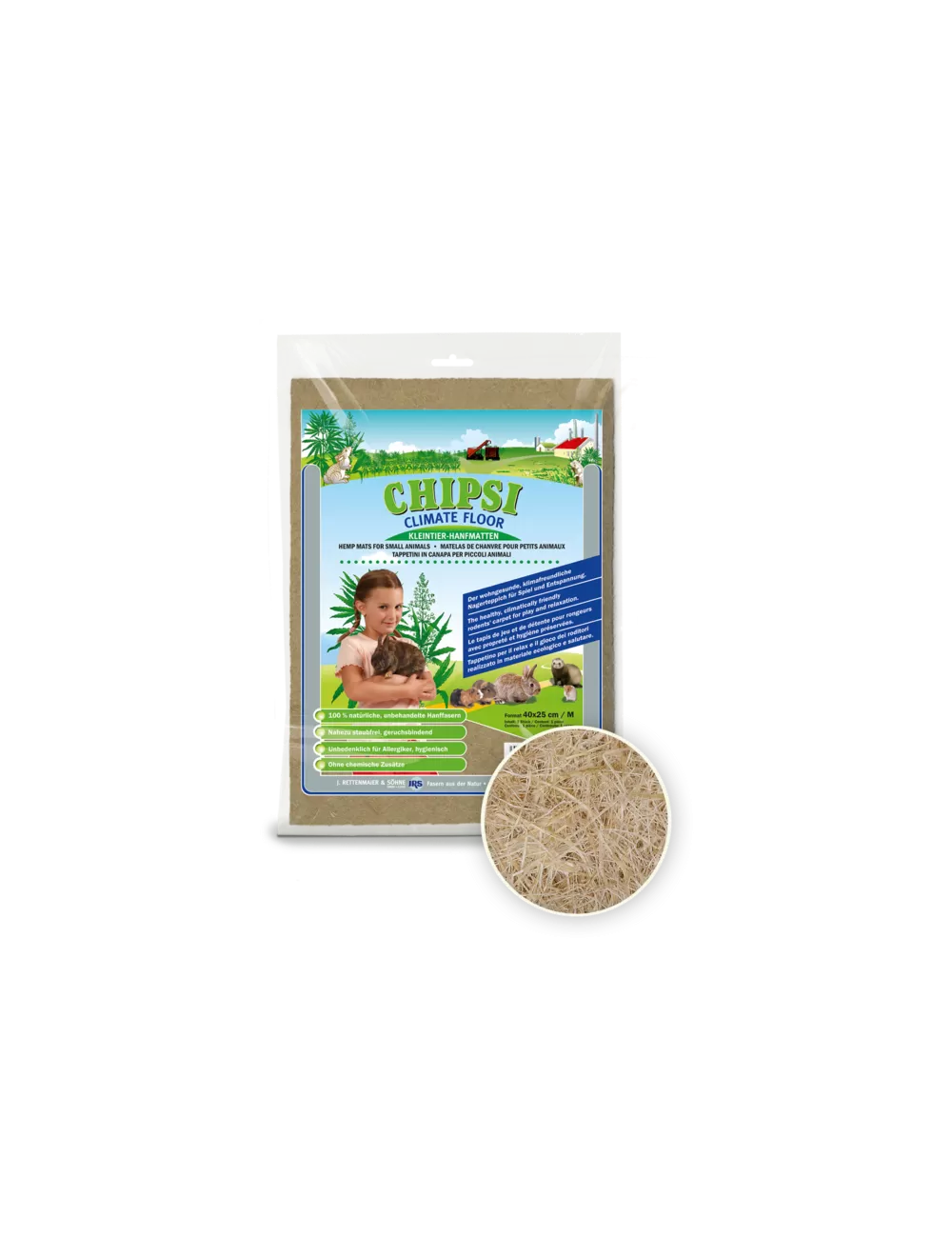 La alfombra de cáñamo CHIPSI Climate Floor es el pequeño y acogedor nido que su roedor merece. Diseñado para absorber líquidos de manera eficiente, mantiene un ambiente limpio y seco. No más frío, humedad ni hogares que se ensucian demasiado rápido. Con CHIPSI Climate Floor, su pequeño compañero estará en un refugio de comodidad.