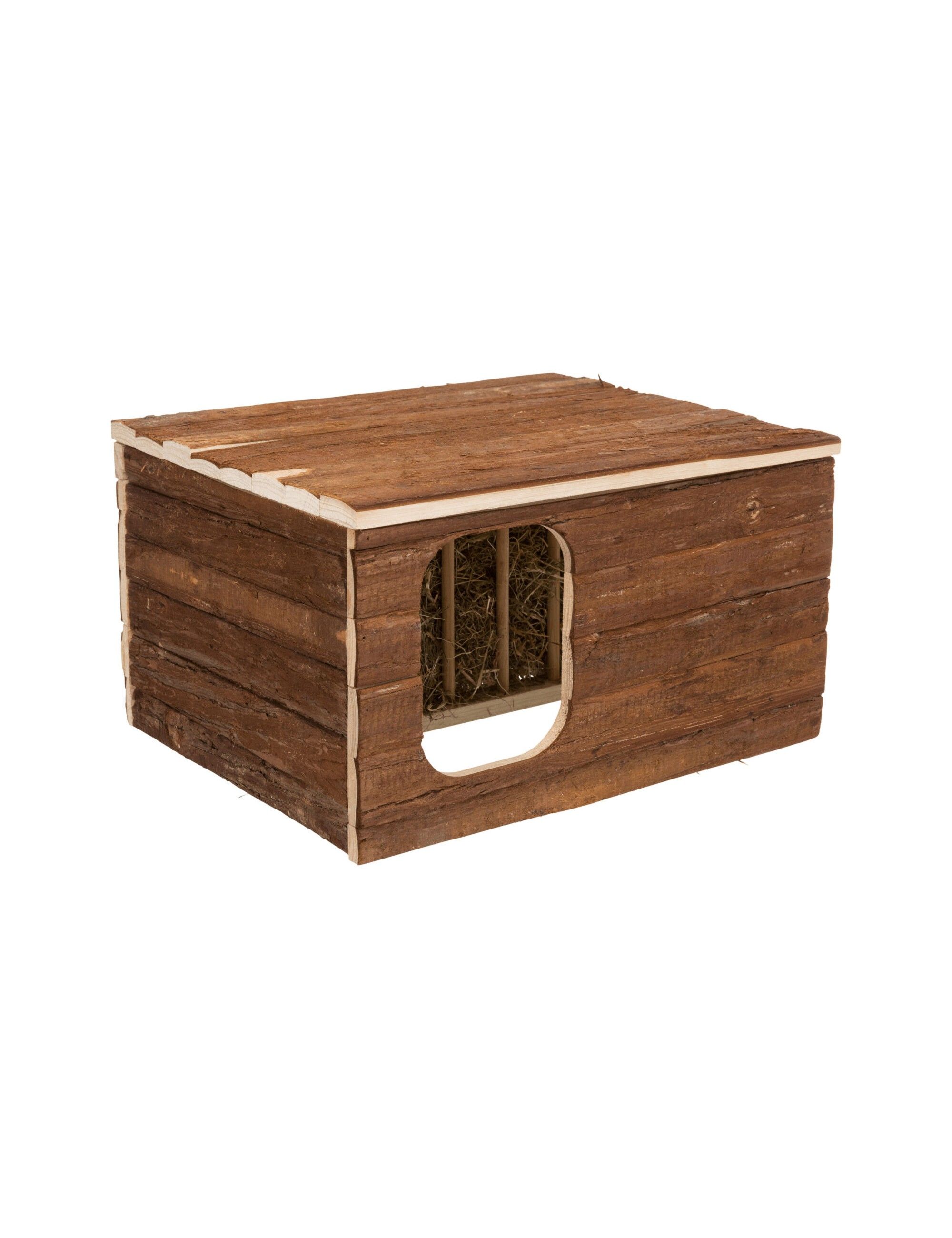 La Casa Trixie "Hilke" , con su comedero integrado, es la solución ideal para los dueños de roedores preocupados por el bienestar de sus animales. Fabricada con madera natural y diseñada sin resinas tóxicas , ofrece un refugio seguro y ecológico. Su techo y sus altas salidas evitan que el heno se esparza. Con una plataforma de descanso en el techo y dos prácticas entradas/salidas , esta casa garantiza comodidad y libertad de movimiento para tu mascota.
