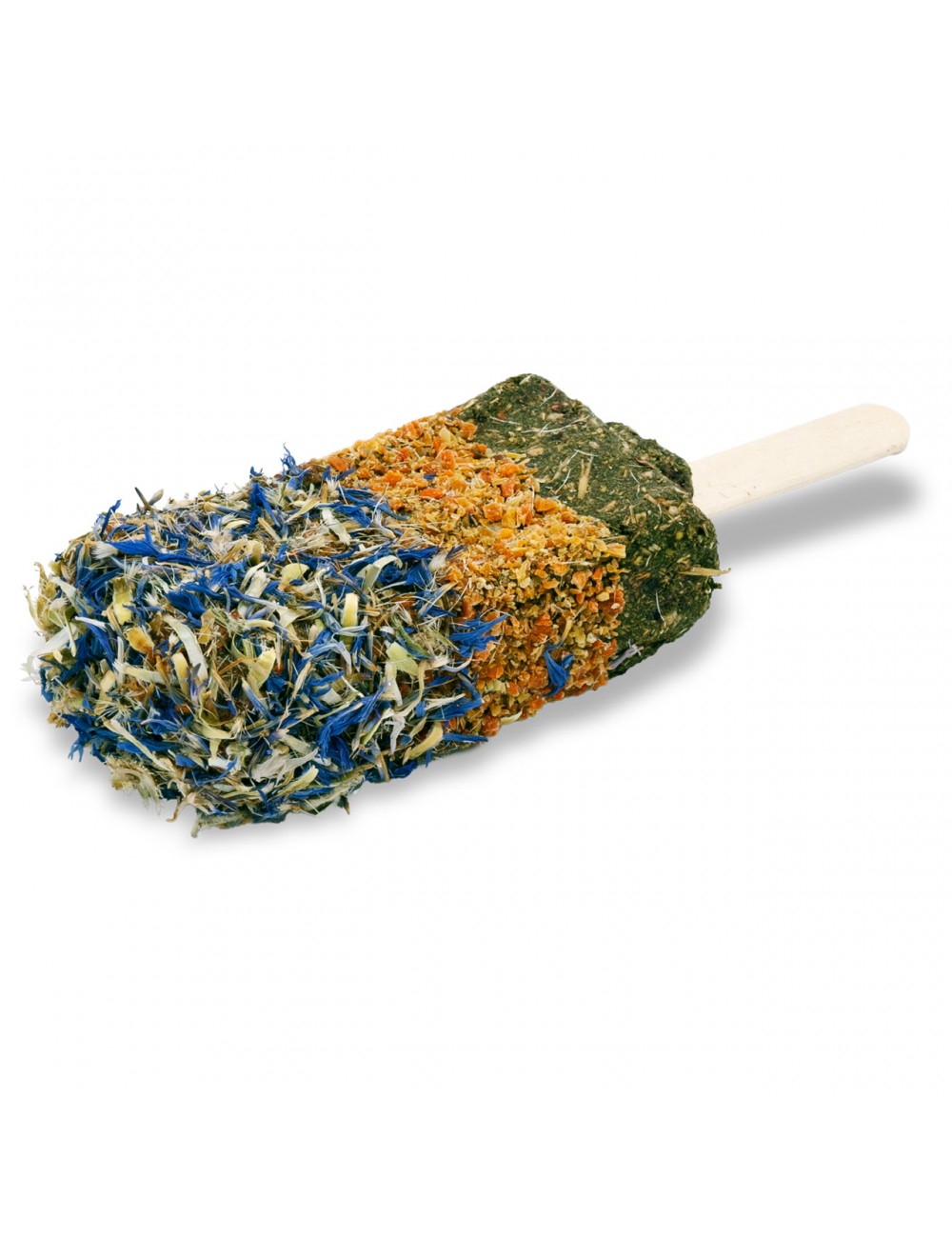 El helado crujiente en palito de JR FARM es una delicia única que hará las delicias de tus roedores y conejos enanos durante todo el año. Elaborado con heno de pradera, hierbas frescas y recubierto con crujientes zanahorias y flores de aciano, este helado no es sólo una delicia sino también un juego entretenido y beneficioso. Perfecto para estimular tanto la digestión gracias a su alto contenido en fibra como la abrasión dental, este helado es una forma divertida de cuidar a tus pequeños acompañantes. El mango de madera natural también sirve como juguete para roer, proporcionando doble placer a tus mascotas.
