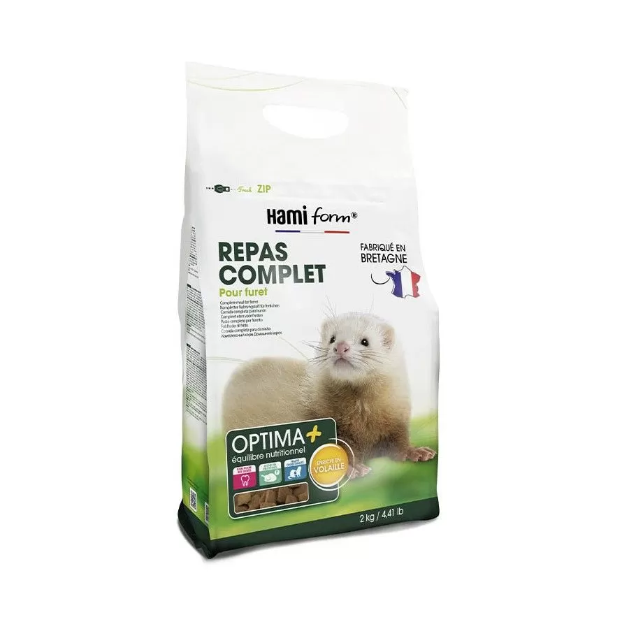HAMIFORM - Optima+ Furet est un repas complet équilibré, riche en protéine, formulé spécifiquement pour satisfaire les besoins singuliers du furet. Grâce à une combinaison de viandes de poulet, canard et dinde, chaque croquette est un concentré d'énergie, de vitamines et de bien-être pour votre petit compagnon.