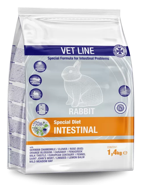 CUNIPIC Vetline Rabbit Intestinal è studiato per il benessere digestivo dei conigli , integrando piante officinali e fieno di prato selvatico in una formula unica che tratta e previene i disturbi intestinali . Questo alimento completo offre una soluzione naturale ed efficace per i conigli che soffrono di disturbi come diarrea, infiammazione intestinale e insufficienza pancreatica esocrina , tra gli altri.