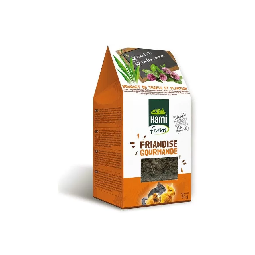 Saluta la natura con i “Dolcetti Gourmet” di Hamiform ! Bouquet di dolcetti di trifoglio e piantaggine è una deliziosa miscela di piantaggine e trifoglio rosso per conigli e roditori. Aiuta una buona digestione e ha proprietà antinfiammatorie grazie al trifoglio e alla piantaggine. Senza aromi artificiali né conservanti , sono pensati per deliziare le papille gustative e aumentare la vitalità dei tuoi piccoli compagni.