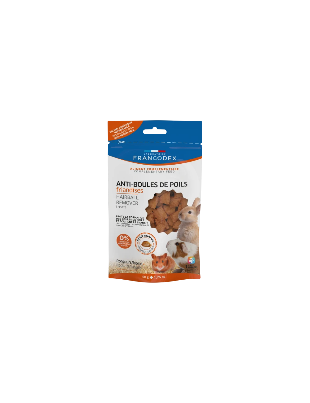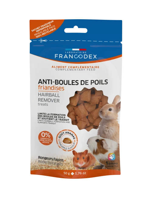 Durante a queda, os coelhos costumam ingerir pelos que se acumulam e formam bolas no estômago, o que pode causar bloqueios graves. As guloseimas Francodex são formuladas com malte e mamão, dois ingredientes naturais que facilitam a passagem dos cabelos pelo sistema digestivo, ajudando a prevenir acúmulos nocivos.